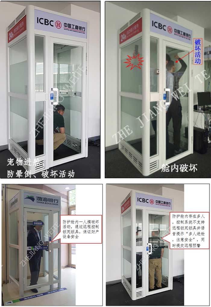 当人员破坏舱门锁具、破坏打砸活动,后台监控中心视频弹出预警提示,并同时调用顶部摄像头实时监控防护舱现场情况。